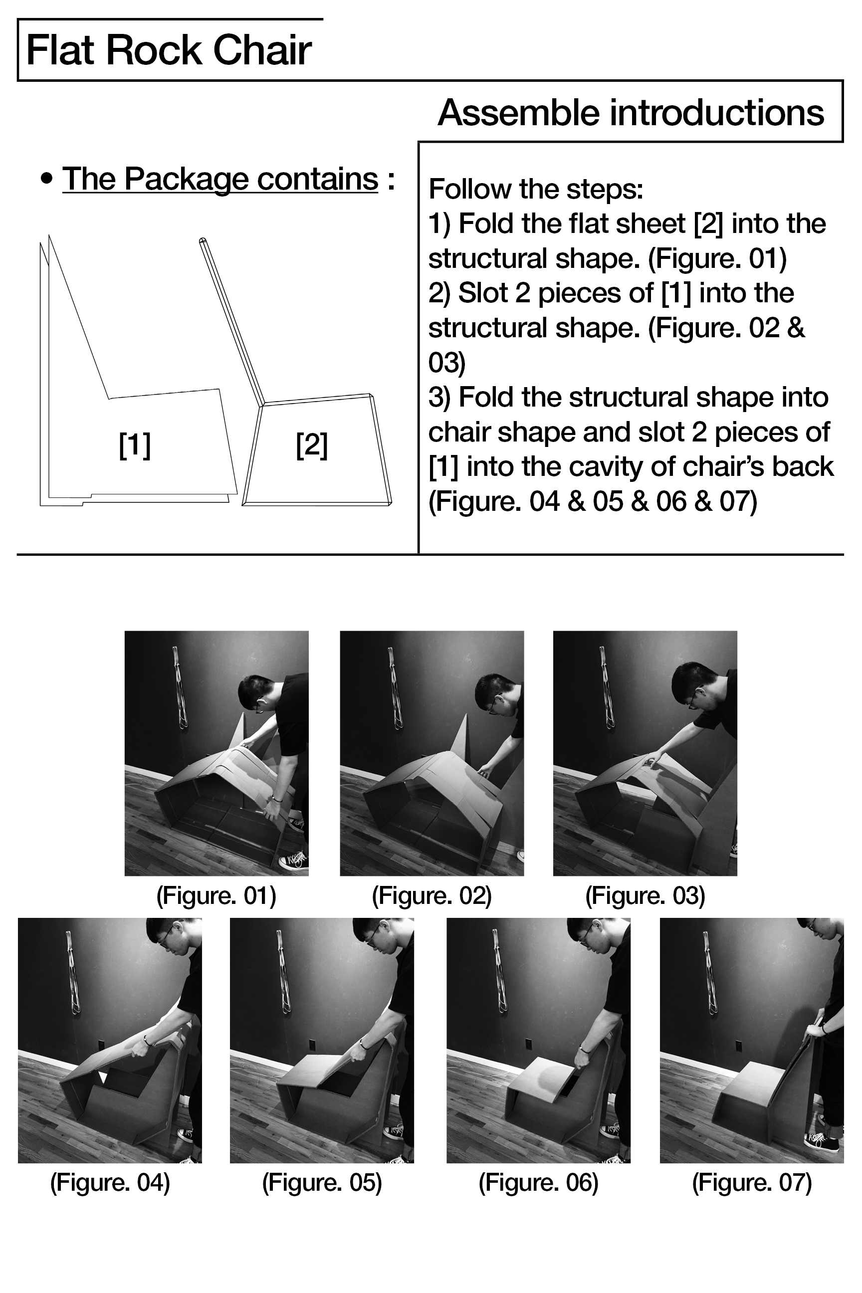 • The ‘Flat Rock Chair’ simply converts a flat sheet of cardboard into a integrated chair in seconds.The design breaks the conventions on the typical use of the cardboard. In order to save space in the small area, the ‘Flat Rock Chair’ can be easily hung on the wall for storage when needed. It is also perfect for flat pack shipping when folded. The ‘Flat Rock Chair’ chair is created to fold and slot expediently to assemble comfort and minimalist lounging seating in small residential spaces. Target Audience: College Students Total Cost of 2 Double-layers Cardboard (4′ * 8′) : $18 – Design Process of the Flat Rock Chair – – Ergonomics & Dimensions – – Rendering View – – Assemble Introductions – RelatedTags: Iam
