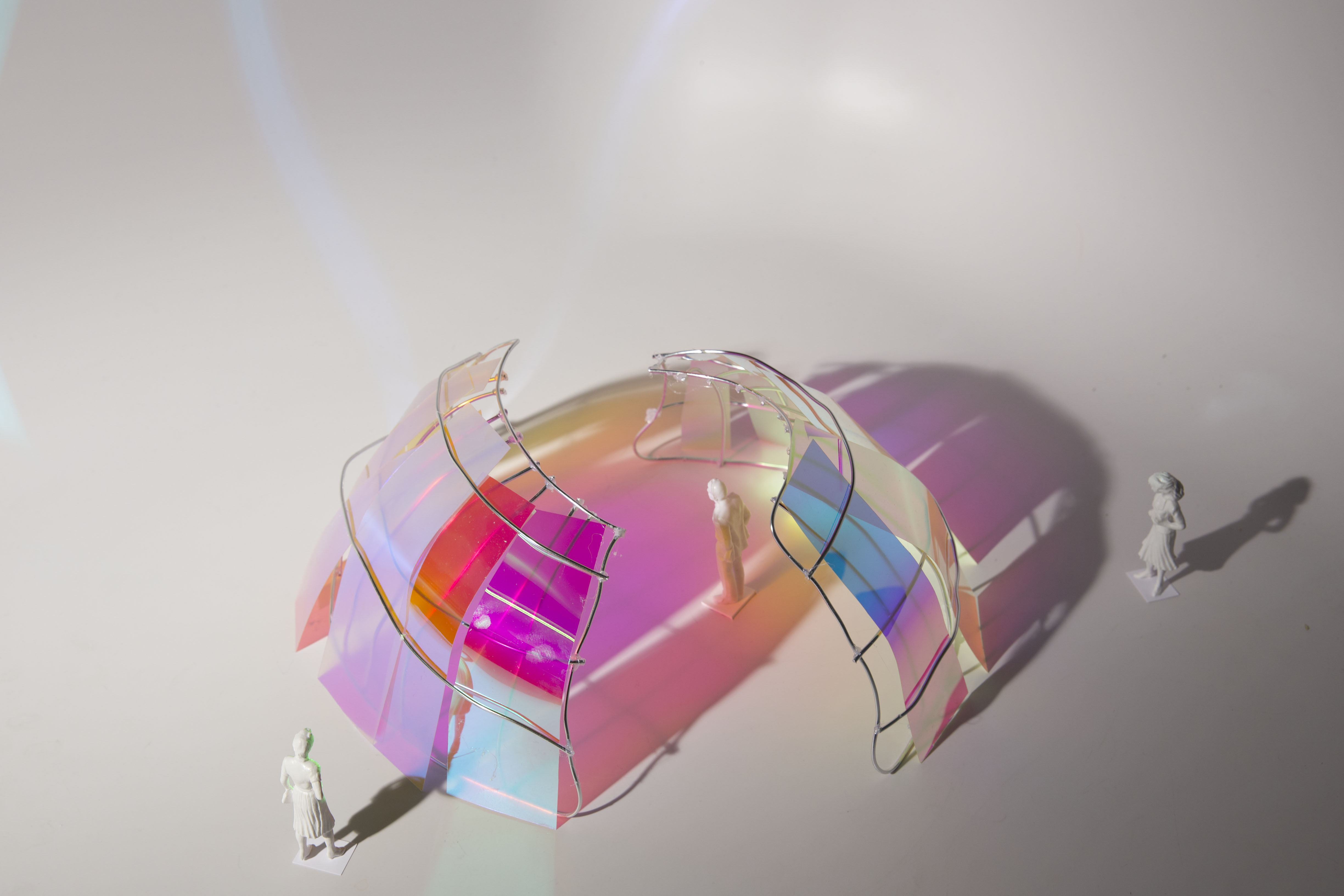 Dichroic Aura captures the phenomena of light and color by utilizing dichroic material in order to communicate to the audience the relationship between the ray of light and colors through transmission and reflection. The installation consists of two separate forms. One of the forms has dichroic tinted with warmer colors, while the other one has cooler colors. The warmer piece transmits cyan, blue, magenta, and reflects red and gold; while the cooler piece transmits blue, magenta, yellow, and reflects blue and gold. Throughout the course of the day, as the sun moves across the sky the colors of light move and mix on the ground like an artist’s palette. Due to the location of the sun, the colors in the shadows mix well from sunrise to late morning, and late afternoon until sunset. When the sun is at its highest peak, around noon, the shadows are less likely to mix allowing for the pure colors of each dichroic panel to be seen.