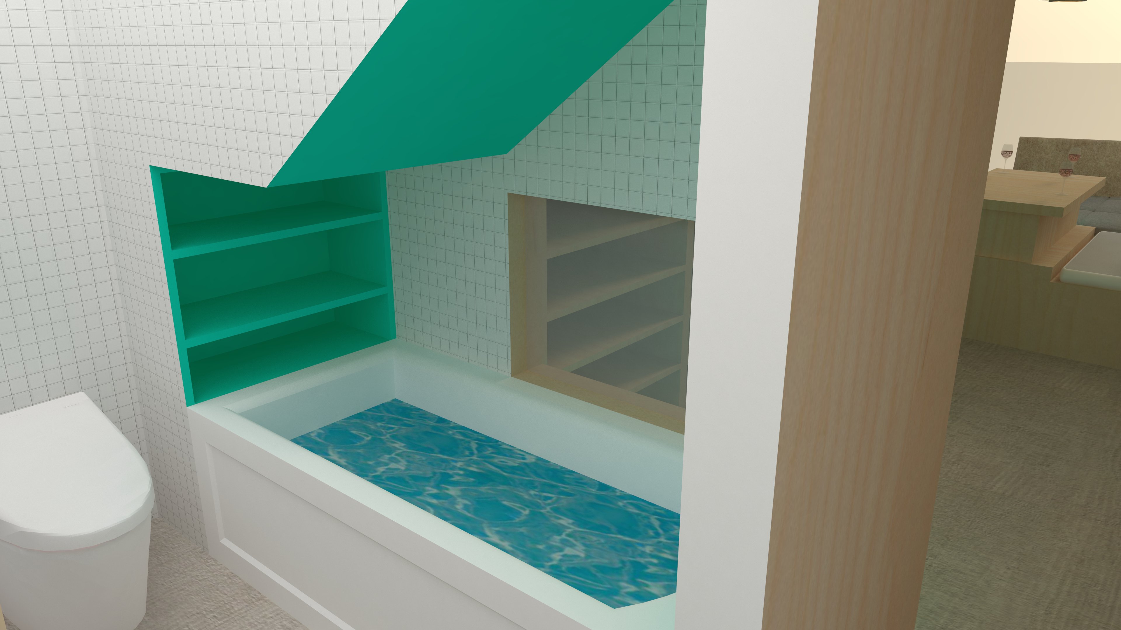 View from window, showing activated eating and gathering area. Table and back of the seats are two parts combined for either one person use or dinner party. Front face of built in structure in same bright color, also having recessed lighting stripes on the edge to emphasize the terrace. View from loft sleeping area, facing the closet, zero bright color within the space provides a visually calm and cozy zone for resting. (L) Including frosted window in bathroom allows natural sunlight come into the space and provides privacy at the same time. (R)