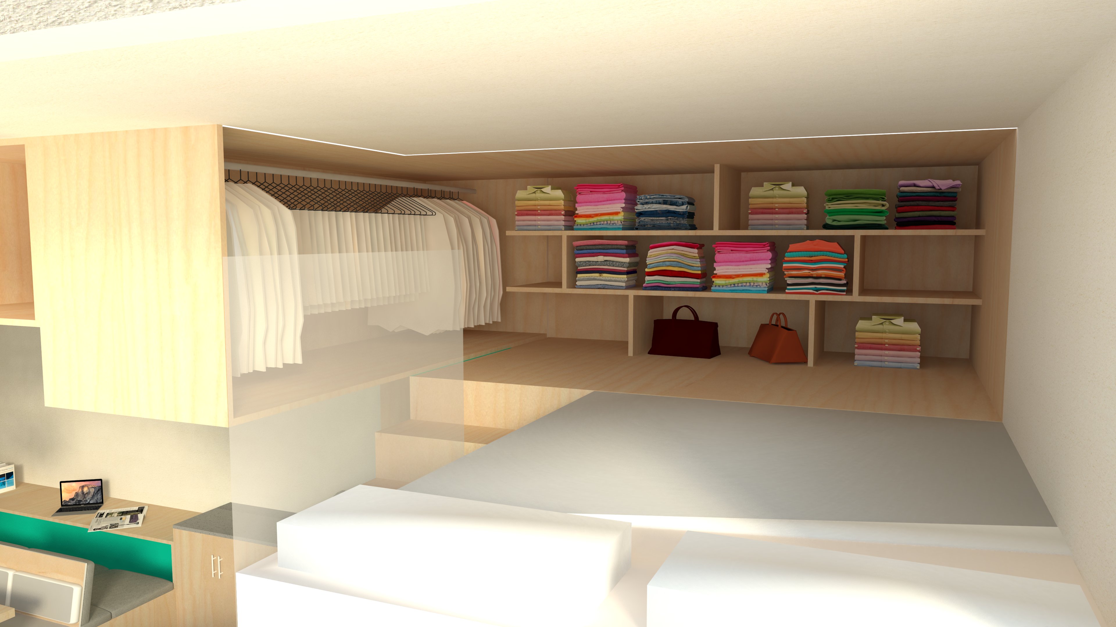 Studio Apartment for Migrants Roommates or Couples Using modularity to create a dual-purpose space for two types of user type, ranging from couples to roommates for utmost space optimisation and allow movement, circulation and transformation. Design Concept Plan Elevation/Sections Mood