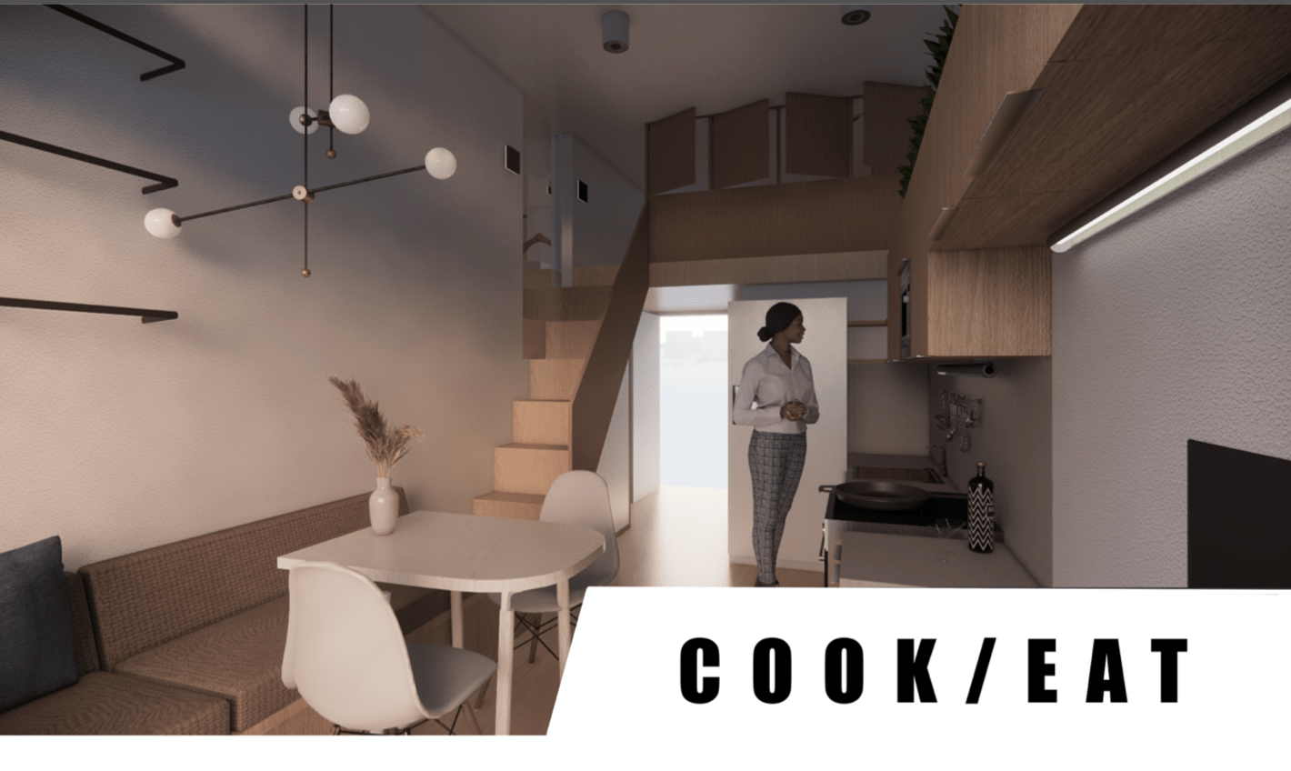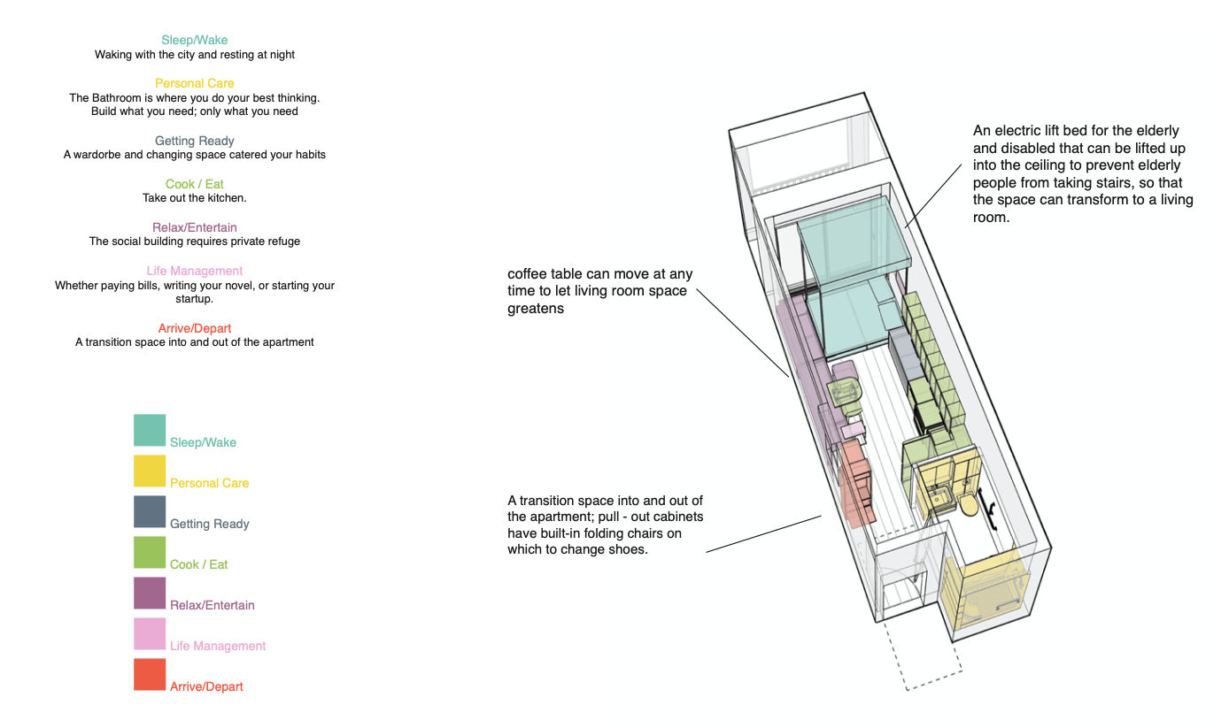 Studio Apartment for Migrants Roommates or Couples Using modularity to create a dual-purpose space for two types of user type, ranging from couples to roommates for utmost space optimisation and allow movement, circulation and transformation. Design Concept Plan Elevation/Sections Mood