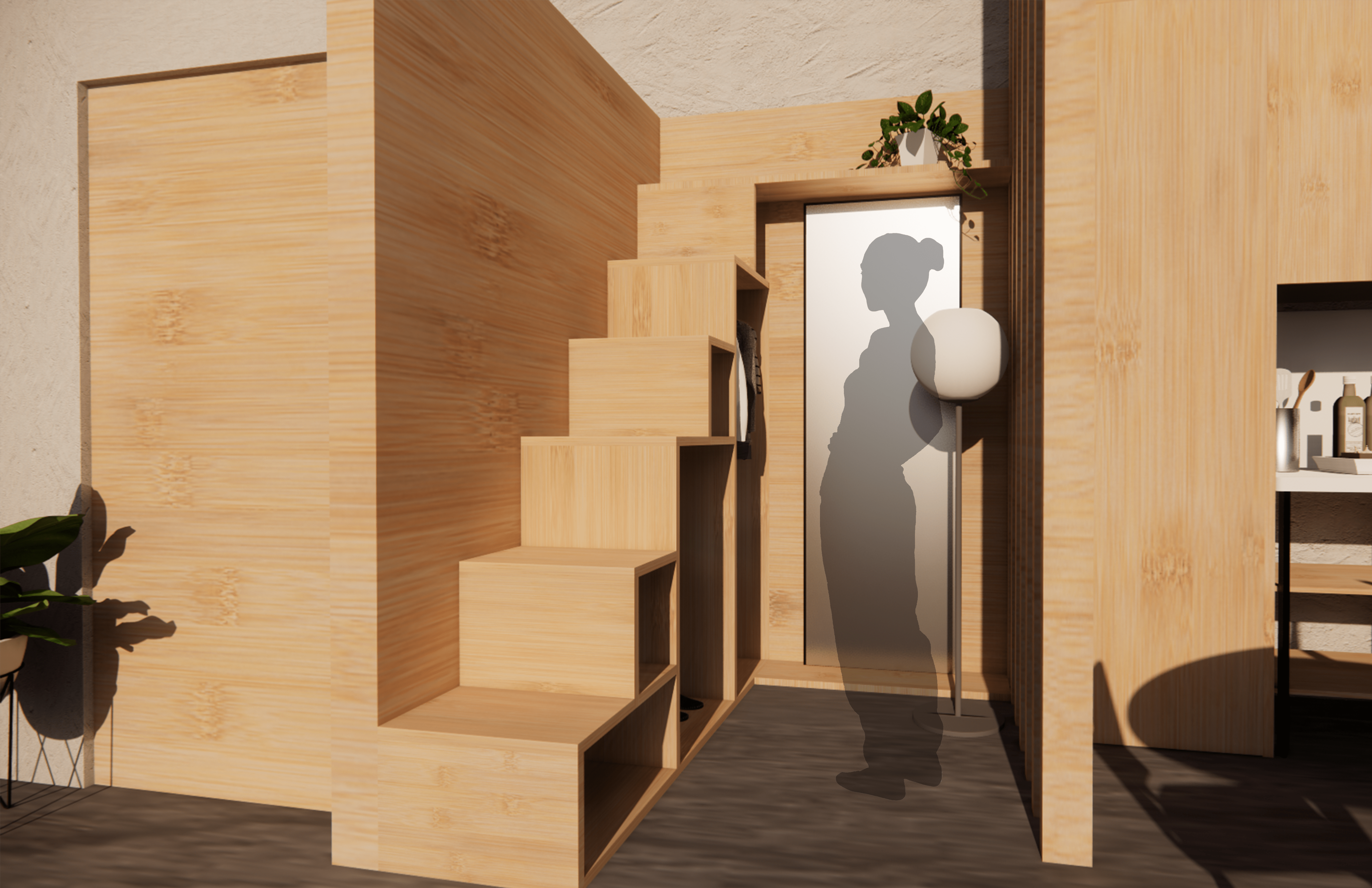 The getting-ready area is composed of built-in storage beneath the staircase. It is tucked under a nook of wooden panels which extend around the lofted bed.